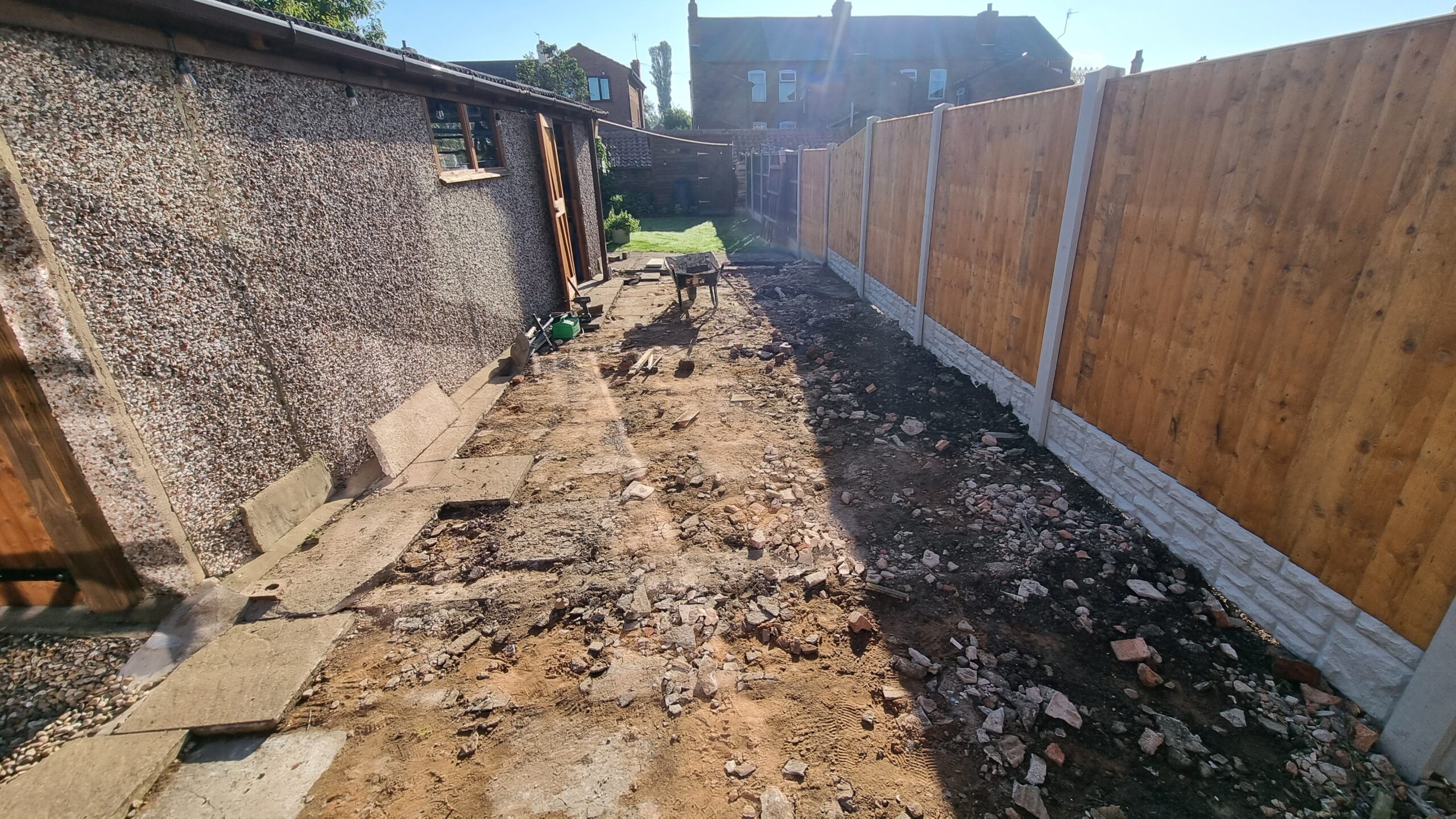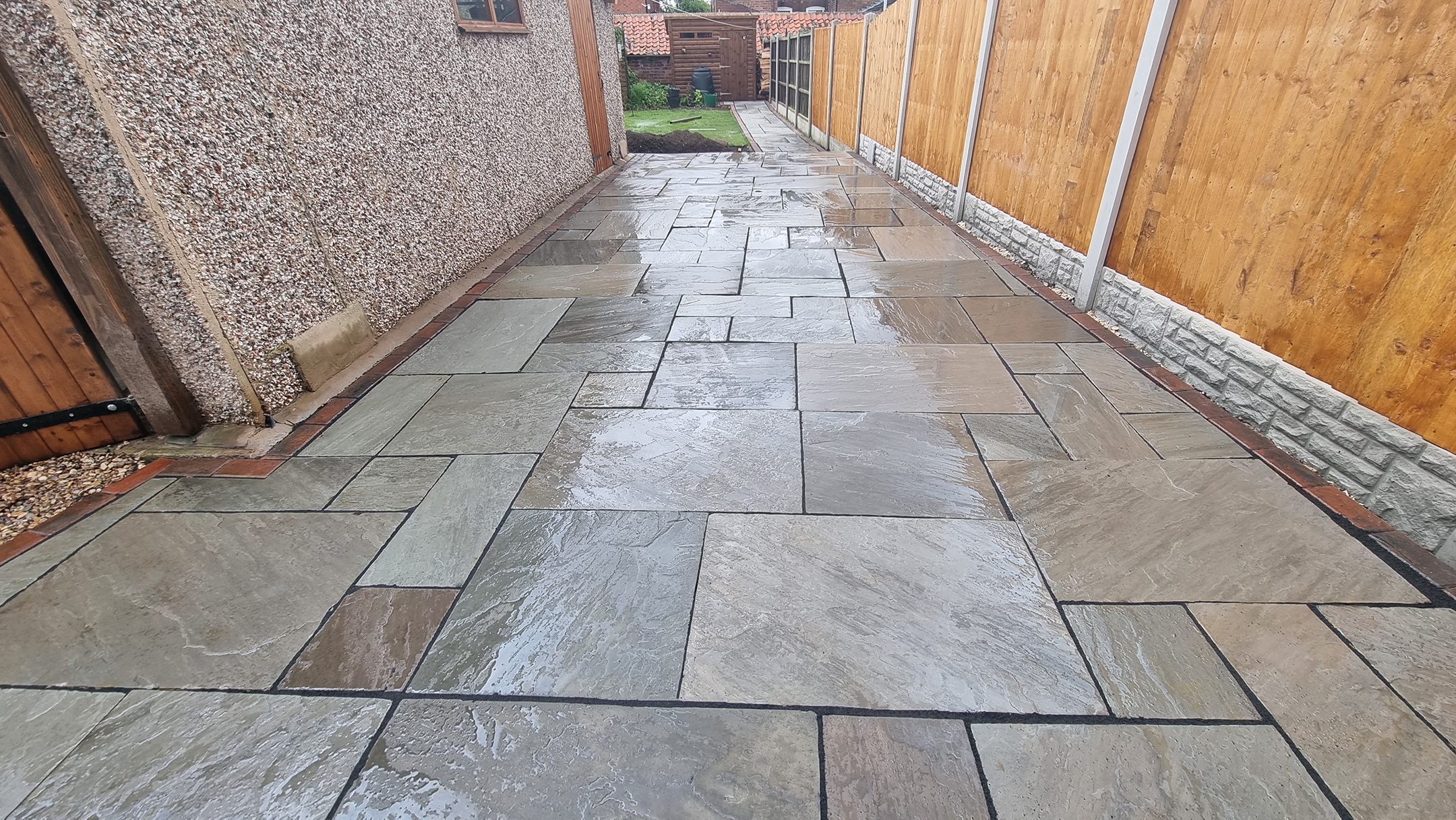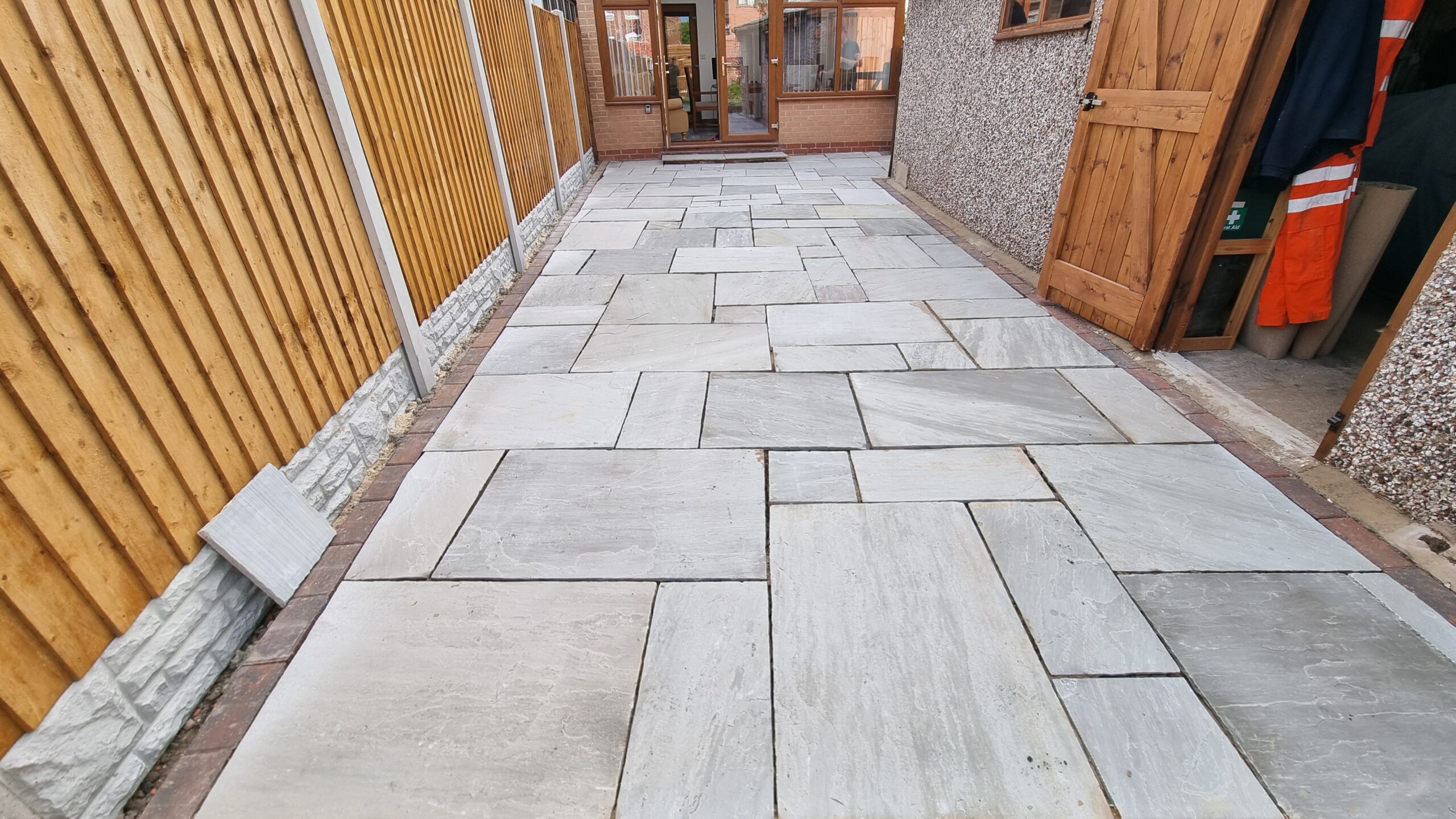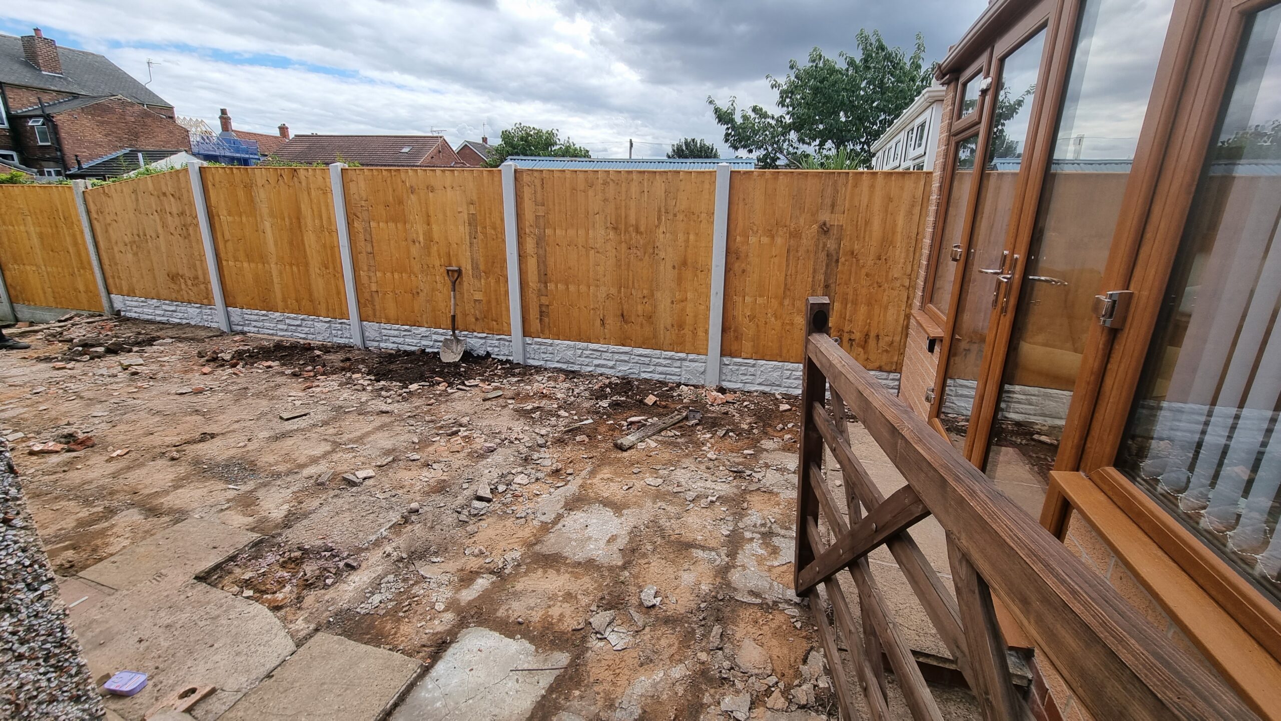 Stunning before-and-after of a bespoke fence and Indian stone patio installation.