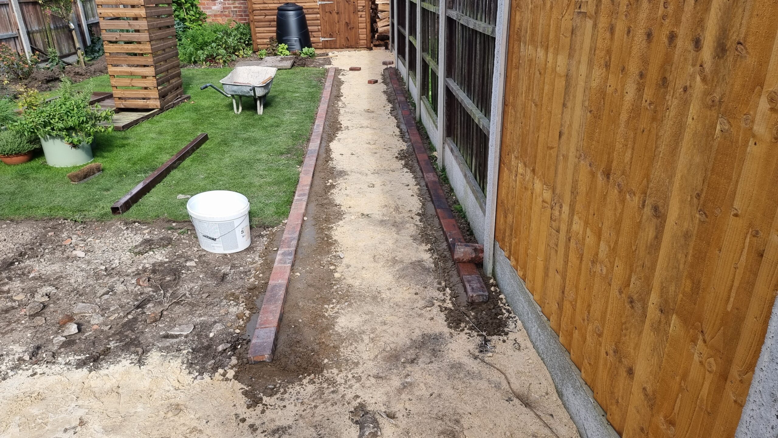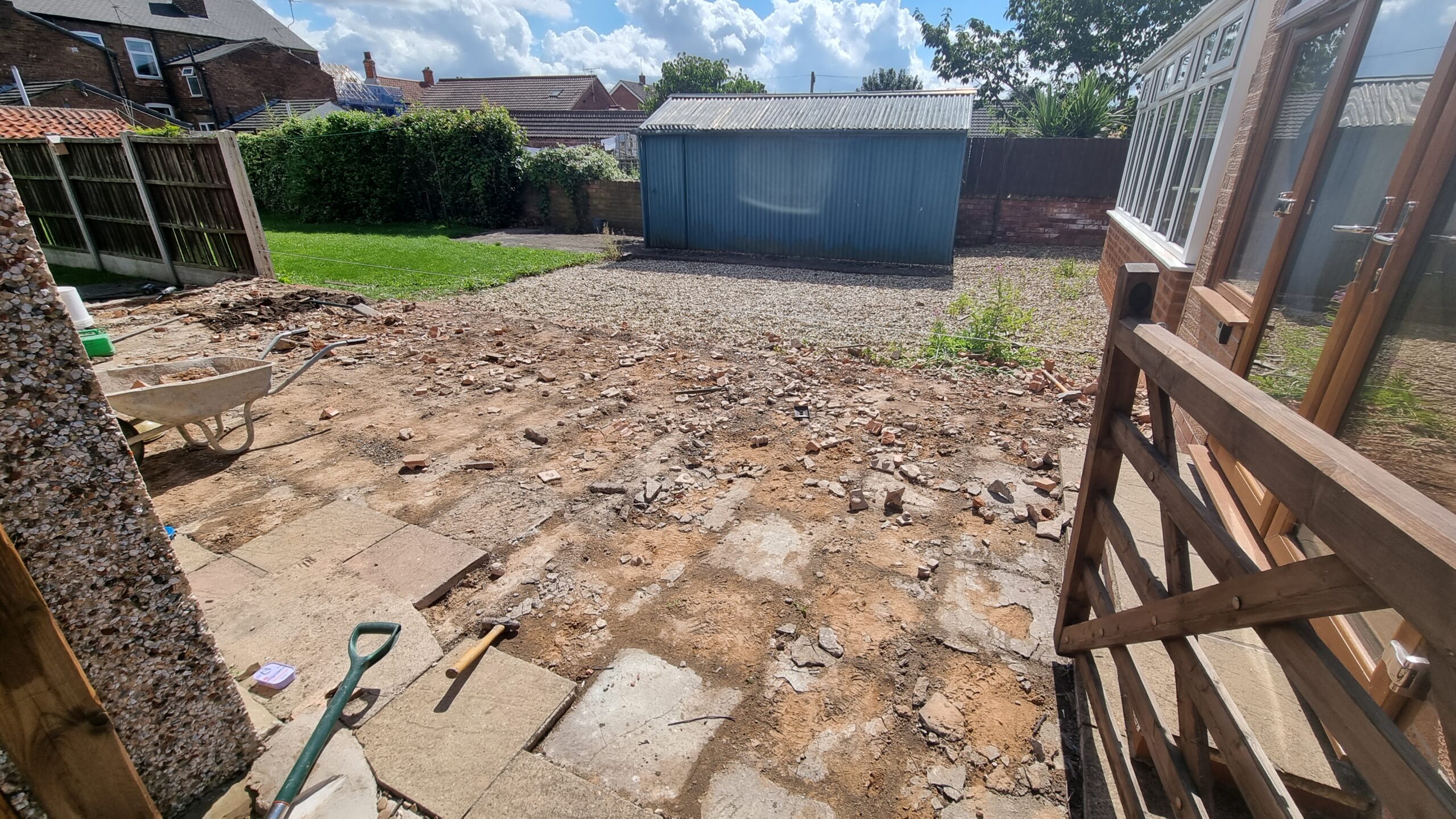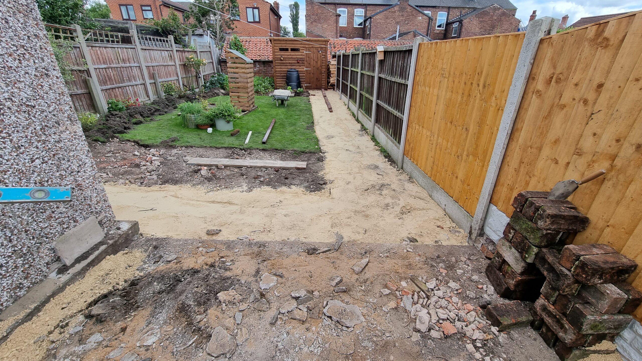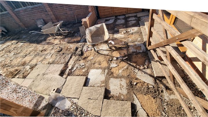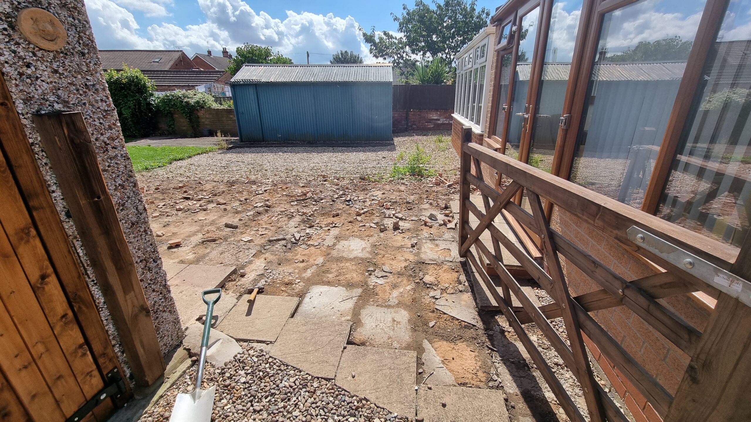 Stunning before-and-after of a bespoke fence and Indian stone patio installation.